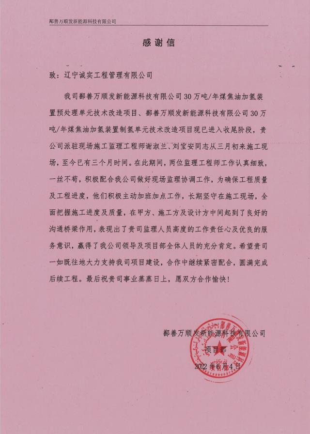 6月6日,公司新疆鄯善項目部收到業(yè)主單位的表揚信。信中,業(yè)主言真意切地對我公司監(jiān)理人員在項目開展期間勤勉盡責(zé)的工作精神給予了高度的贊譽和充分的認可。業(yè)主的表揚是對公司綜合實力、服務(wù)質(zhì)量、技術(shù)水平的又一次肯定,誠實人必將以此為動力,在嚴守安全底線、嚴把工程質(zhì)量大關(guān)的道路上砥礪前行!